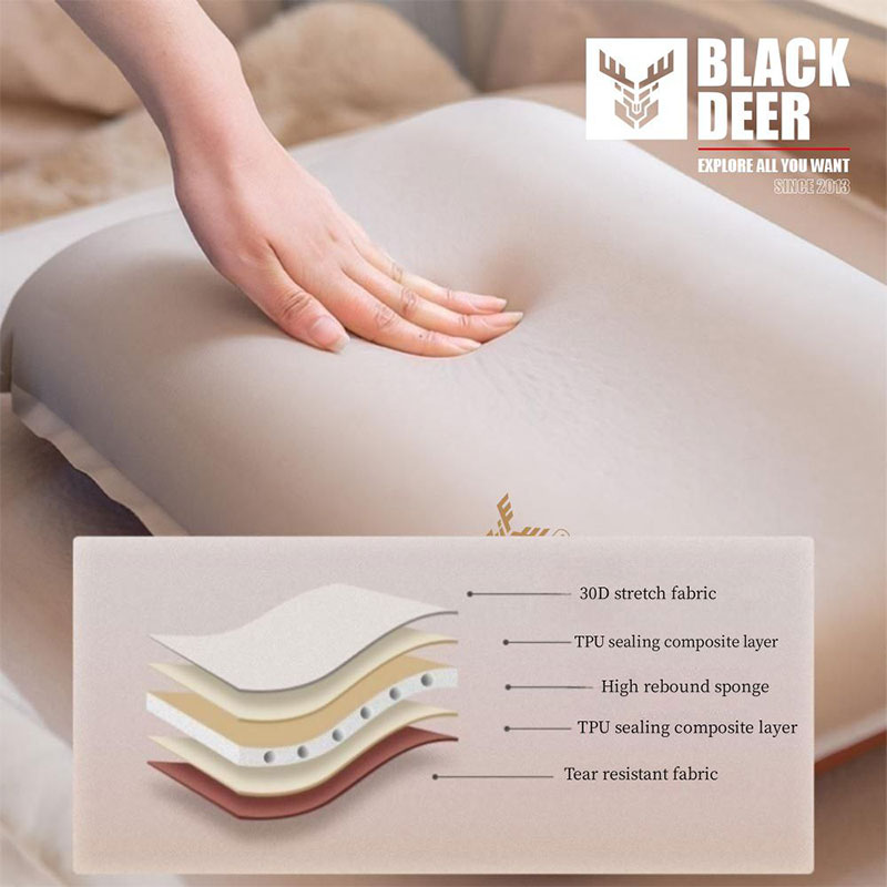 پارچه رویه این بالش از نوع مخمل لوکس ضدتعریق بوده و نرمی و لطافت قابلتوجهی را هنگام استراحت ایجاد میکند. وجود لایه میانی از اسفنج PP موجب میشود بالش پس از باد شدن فرم خود را حفظ کرده و هنگام خواب، گردن و سر را در بهترین وضعیت پشتیبانی کند. لایه زیرین نیز از جنس پلیاستر ریپاستاپ است که در برابر پارگی و سایش مقاوم بوده و دوام محصول را افزایش میدهد.